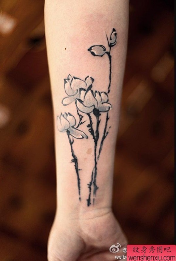 纹身图吧分享一张手臂水墨玉兰纹身图案