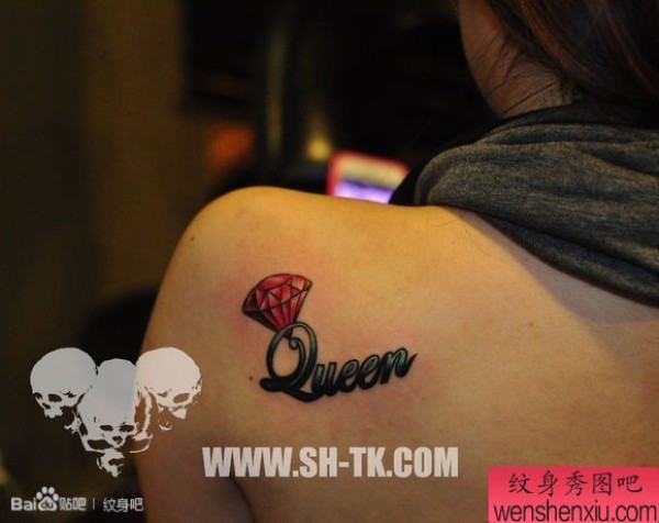 女性肩部爱情之红色钻石纹身图案