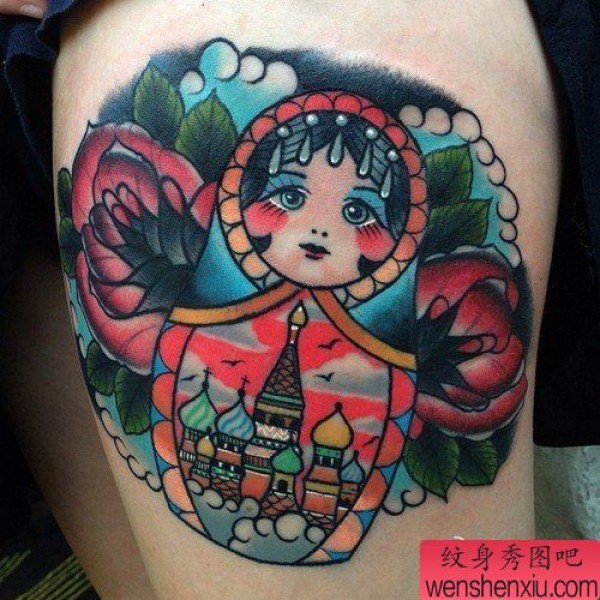 纹身图吧分享一张彩色腿部娃娃纹身图案