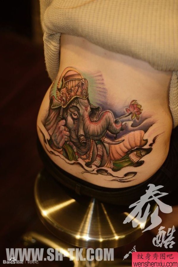 女性腰部财神象纹身图案