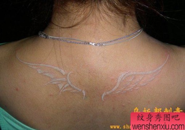 女性肩部一张白色翅膀纹身图案