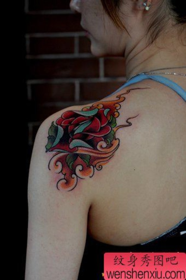 女性肩部一张个性玫瑰花纹身图案