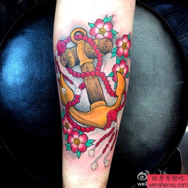 纹身图吧分享一张手臂彩色船锚纹身图案