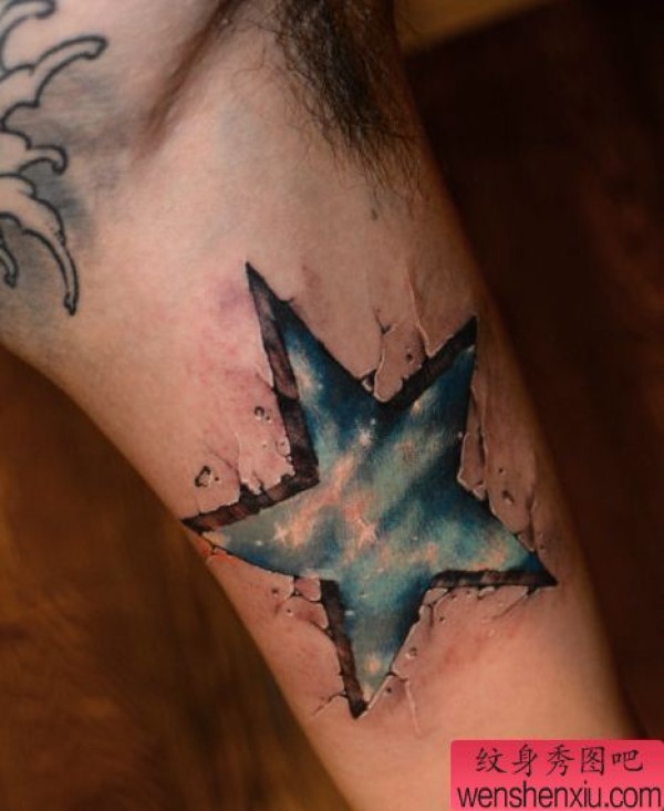 手臂彩色星空烙印五角星纹身图案