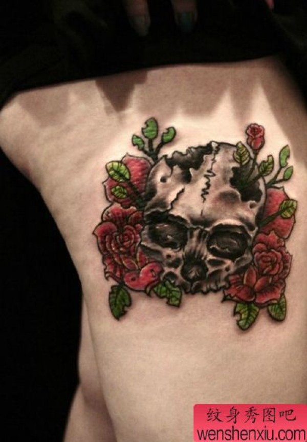 纹身图吧分享一张欧美骷髅头玫瑰花纹身图案