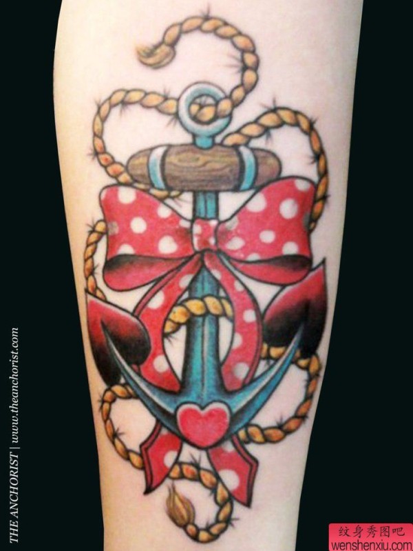 纹身图吧分享一张腿部彩色船锚蝴蝶结纹身图案
