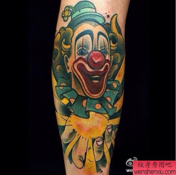 纹身图吧分享一张腿部彩色小丑纹身图案