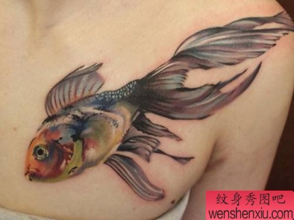 纹身图吧分享一张胸部彩色金鱼纹身图案