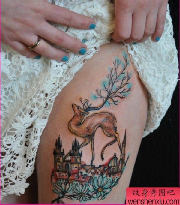 女性腿部彩色羚羊纹身图案由纹身图吧