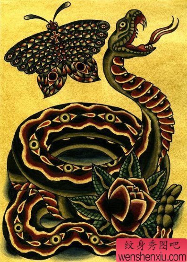 纹身图吧分享一张蛇蝴蝶纹身图案