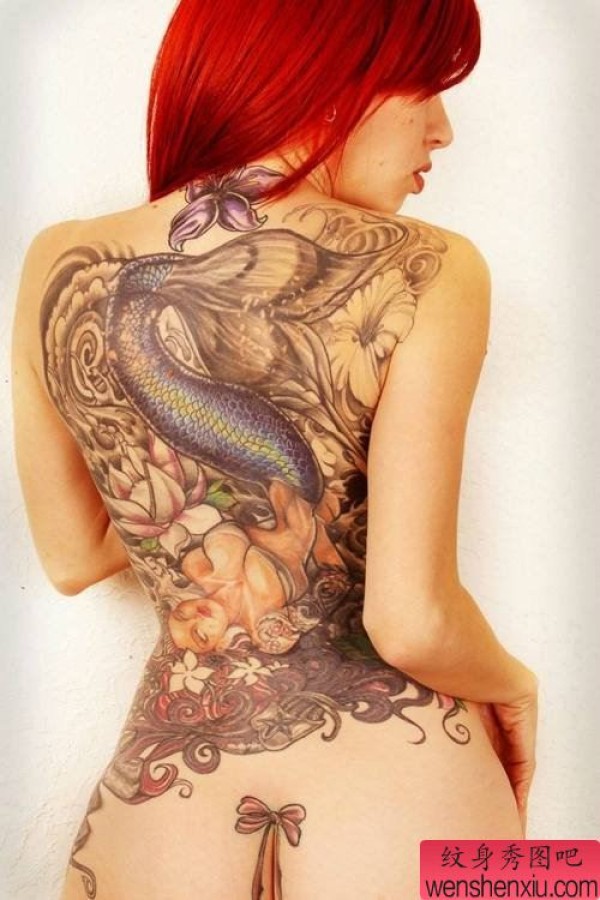 女性满背彩色美人鱼纹身图案