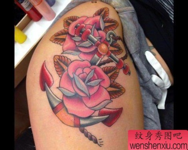 纹身图吧分享一张女性腿部彩色船锚玫瑰花纹身图案