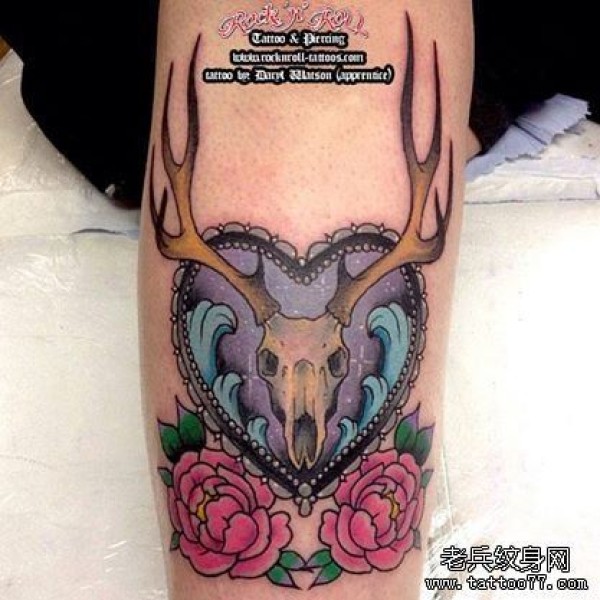 手臂彩色羚羊玫瑰花纹身图案