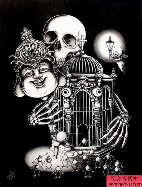 纹身图吧分享一张个性骷髅头纹身手稿图案