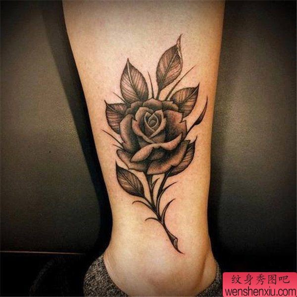 女性脚踝黑白玫瑰花纹身图案