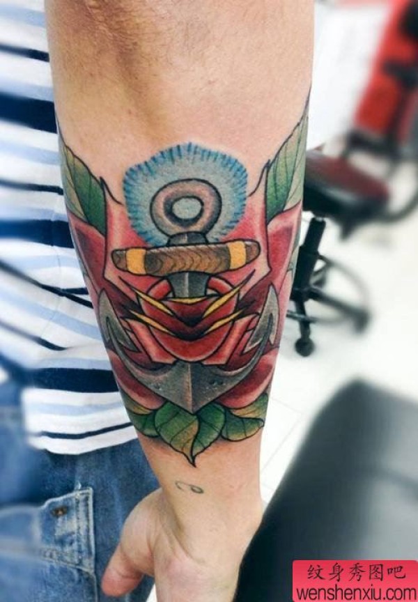 一张手臂彩色船锚纹身图案