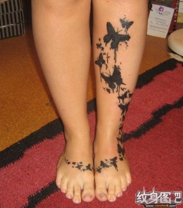 从右脚到左腿纹了几十只黑色的蝴蝶,很灵异的纹身