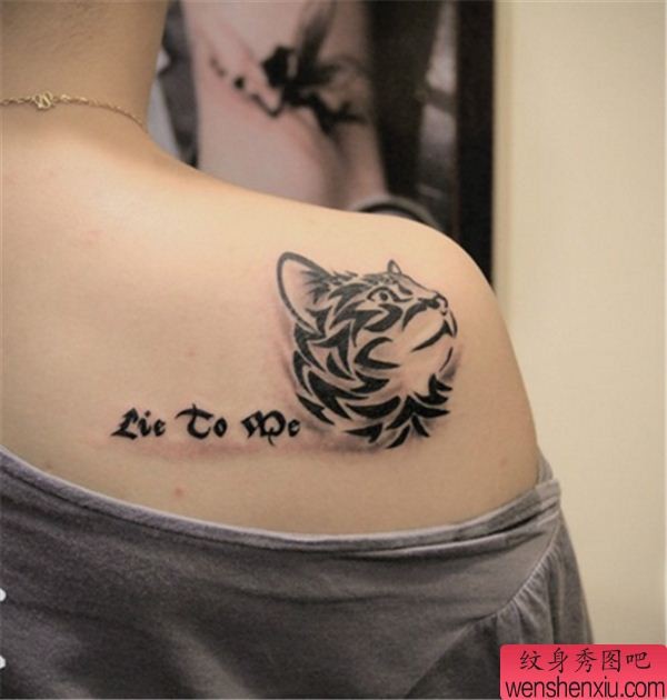 纹身图吧分享一张女性肩背图腾老虎头纹身图案