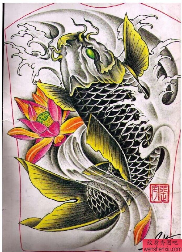 纹身图吧分享一张鲤鱼莲花纹身手稿图案
