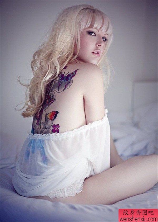 女性背部彩色纹身图案