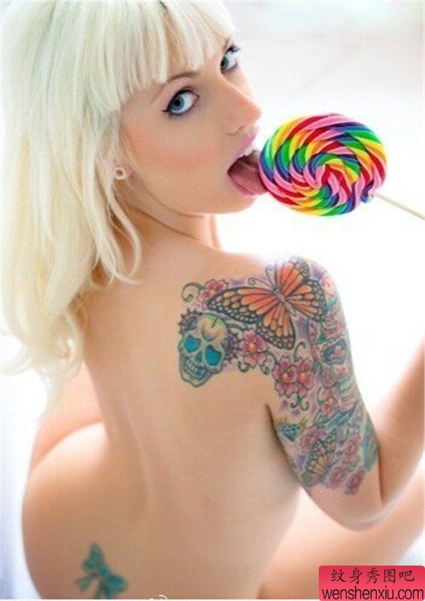纹身图吧分享一张女生肩部骷髅蝴蝶纹身图案