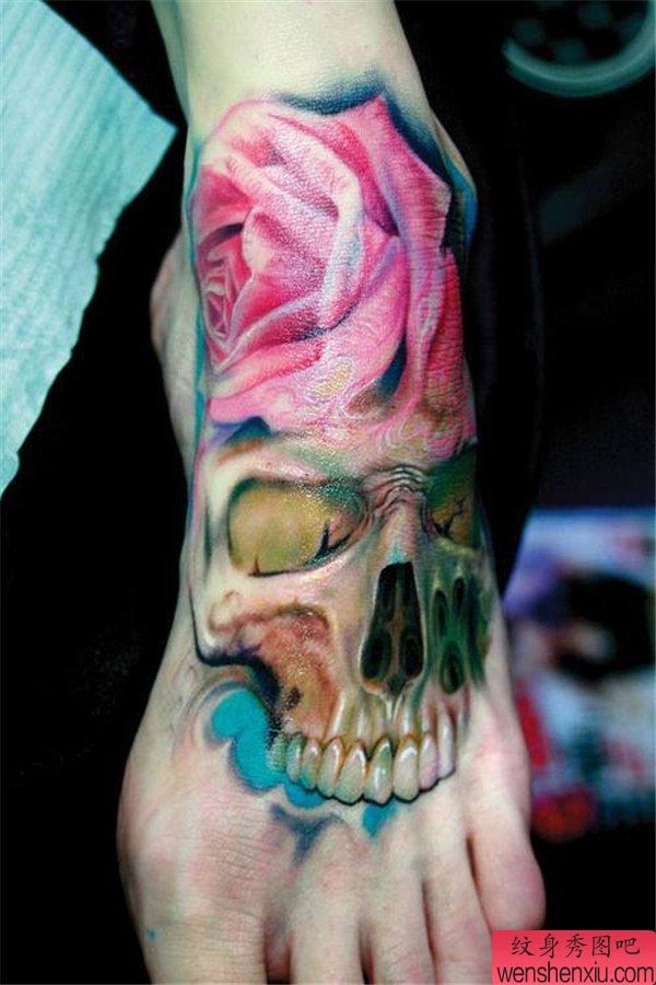 纹身图吧提分享一张脚背个性欧美骷髅头玫瑰花纹身图案