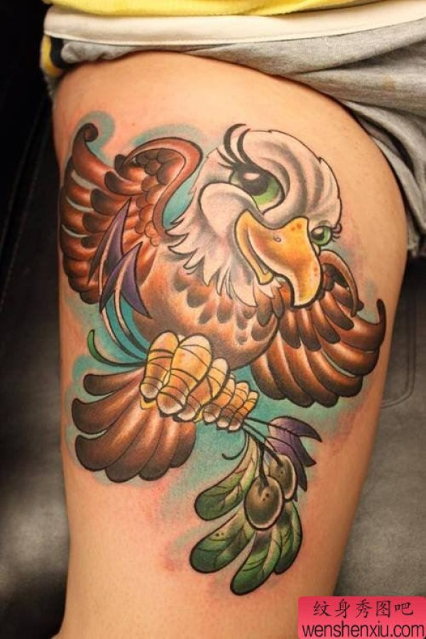 腿部彩色老鹰文身作品