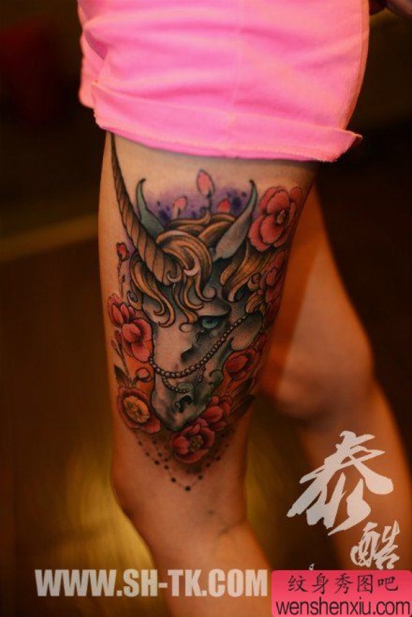 纹身图吧分享一张腿部彩色独角兽文身作品