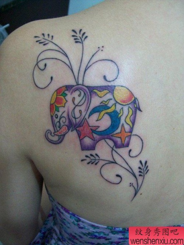 女性背部彩色象文身作品