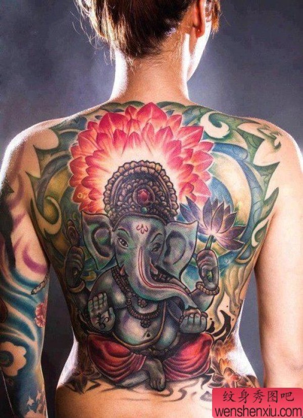 彩色满背象神文身作品