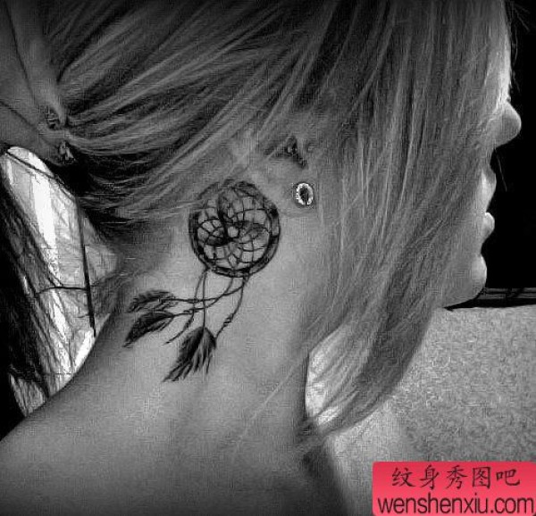 纹身图吧分享一张女性脖子捕梦网文身作品