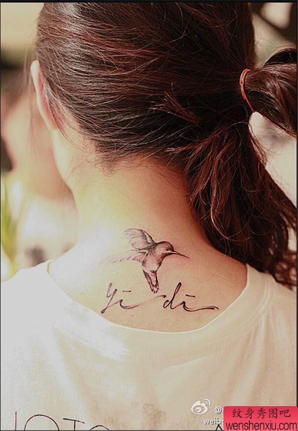 纹身图吧分享一张女性脖子蜂鸟文身作品
