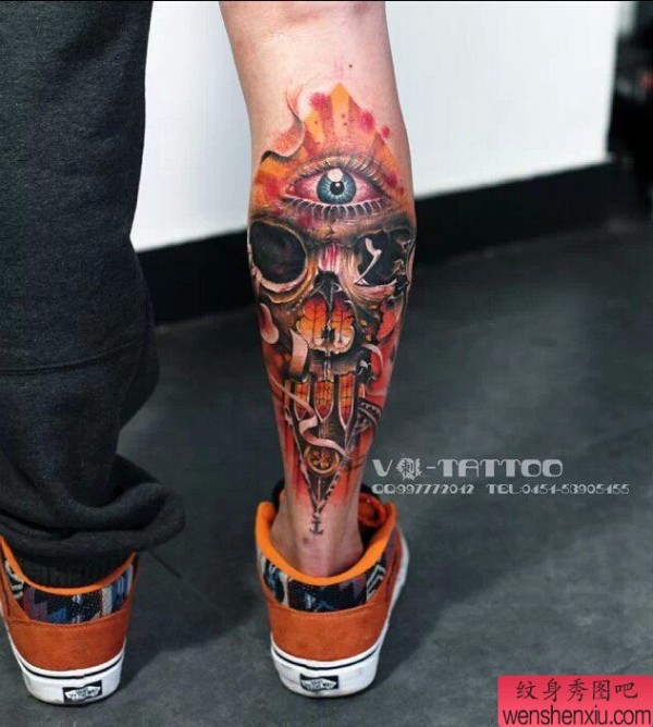 纹身图吧分享一张腿部彩色创意骷髅头眼睛文身作品