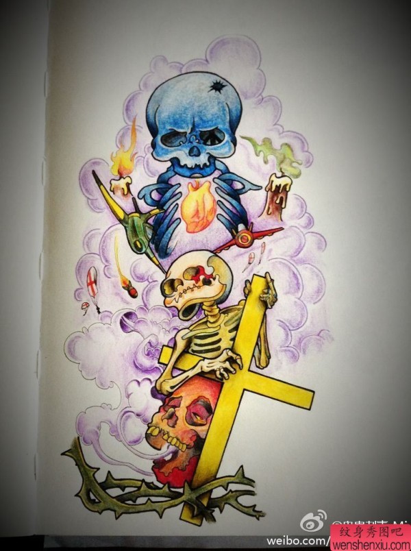 创意骷髅头十字架文身作品