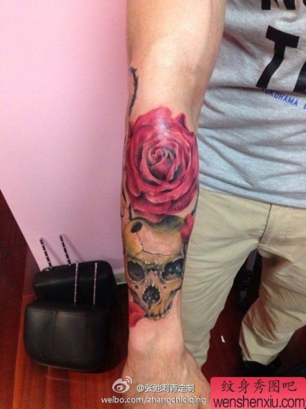 纹身图吧分享一张手臂欧美骷髅头玫瑰花文身作品