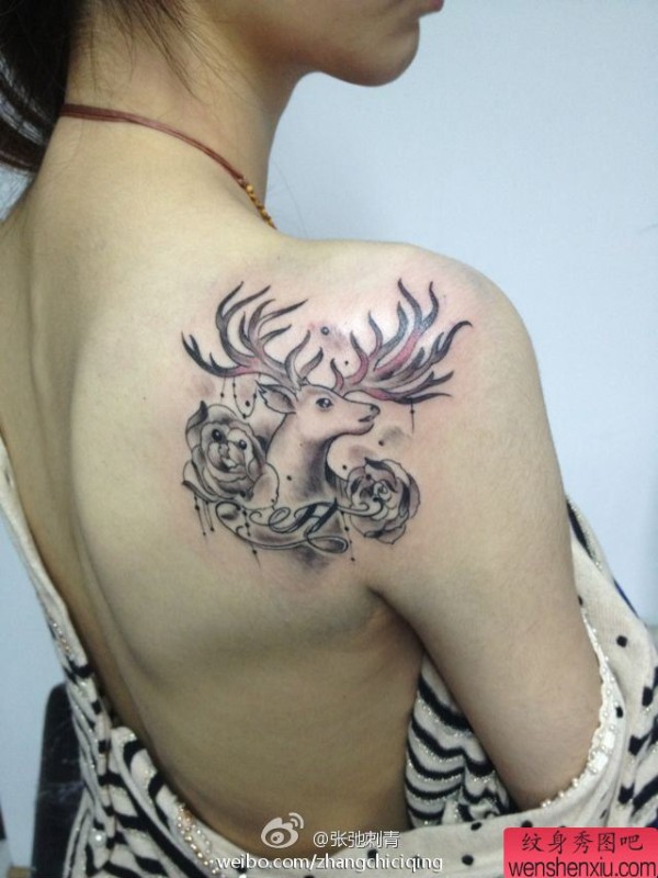 女性肩背羚羊玫瑰花文身作品