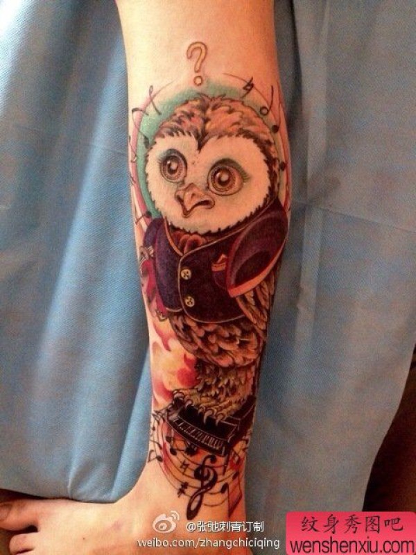腿部猫头鹰文身作品