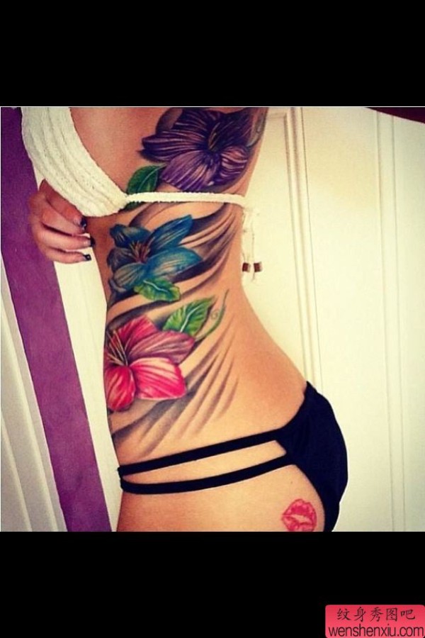 纹身图吧分享一张女性腰部彩色创意花文身作品