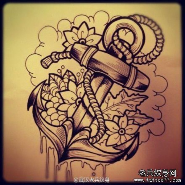 纹身图吧分享一张船锚线稿文身作品