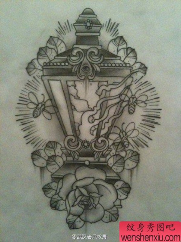 纹身图吧分享一张灯塔玫瑰花文身手稿作品