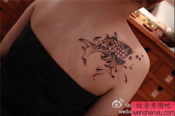 女性肩背金鱼文身作品