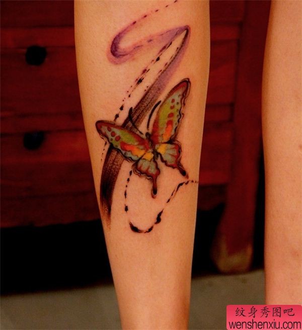 纹身图吧分享一张腿部彩色水墨蝴蝶文身作品