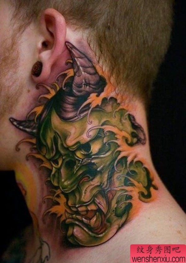 纹身图吧分享一张脖子彩色般若文身作品