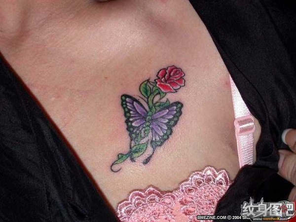 美女胸部红色玫瑰和紫色蝴蝶纹身