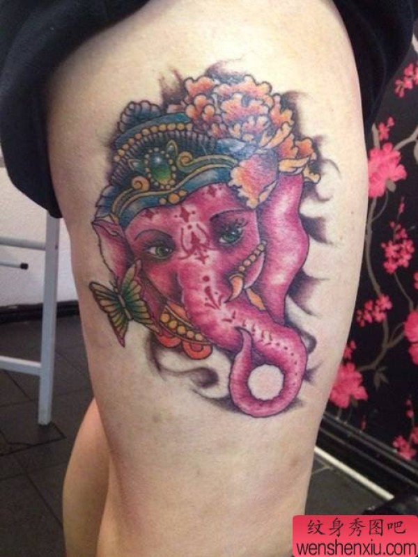 女性腿部彩色象神文身作品