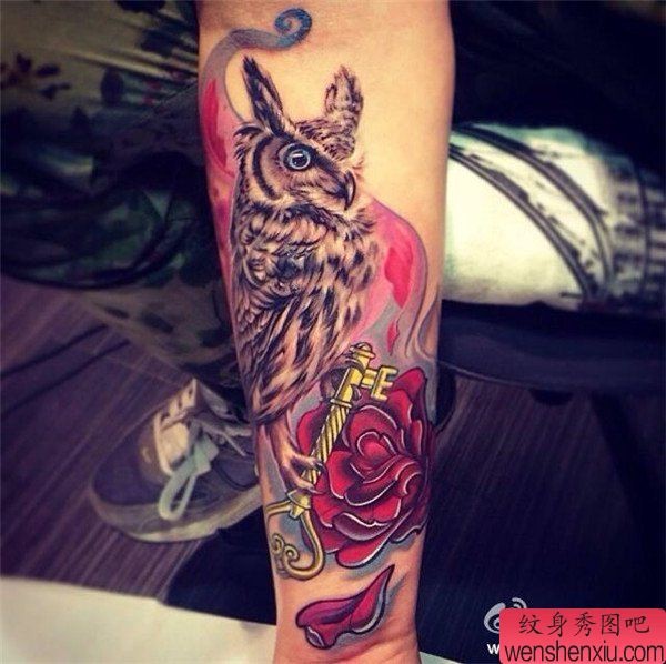 纹身图吧分享一张腿部猫头鹰玫瑰文身作品