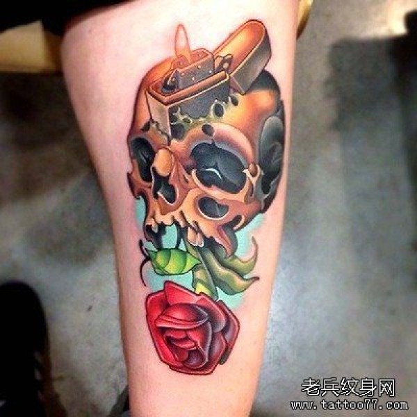 纹身图吧分享一张腿部骷髅玫瑰文身作品