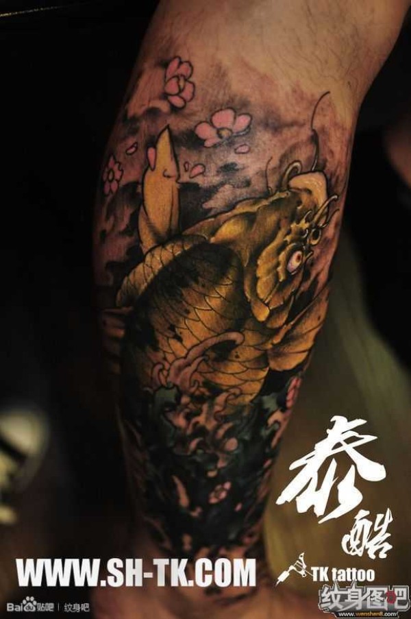 传统鲤鱼花小腿纹身_腿部纹身图案大全_纹身图吧