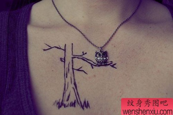 小清新女性胸部树文身作品