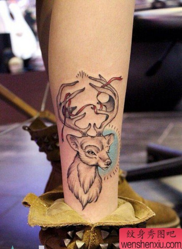 纹身图吧分享一张腿部羚羊文身作品
